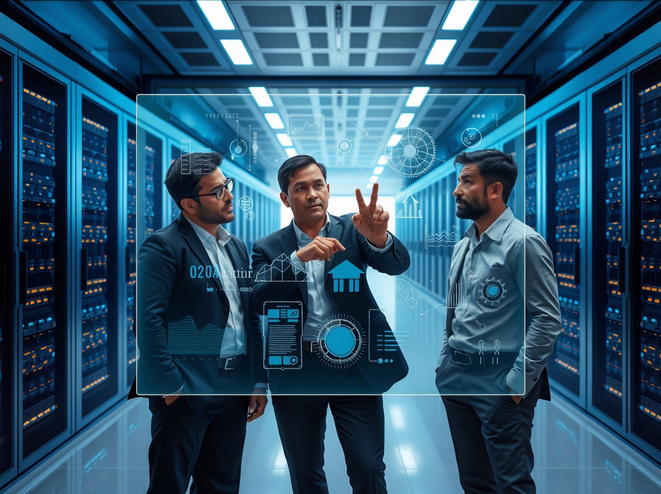 Technology professionals analyzing AI infrastructure data visualizations in a modern data center control room, representing the AI anxiety gap discussion.
