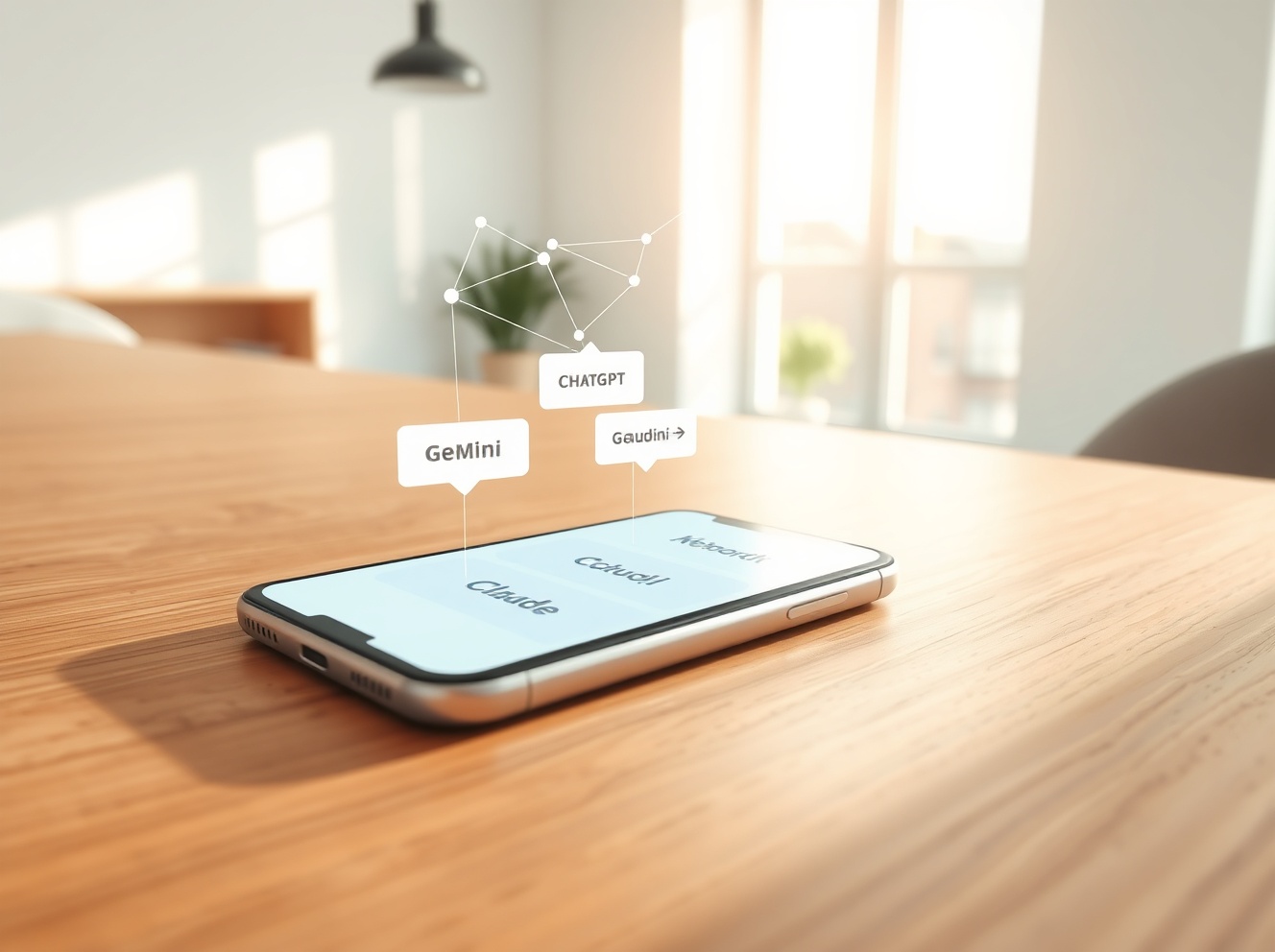 Anuma AI integration service app interface on smartphone showing ChatGPT, Gemini, and Claude chat bubbles with glowing network connections