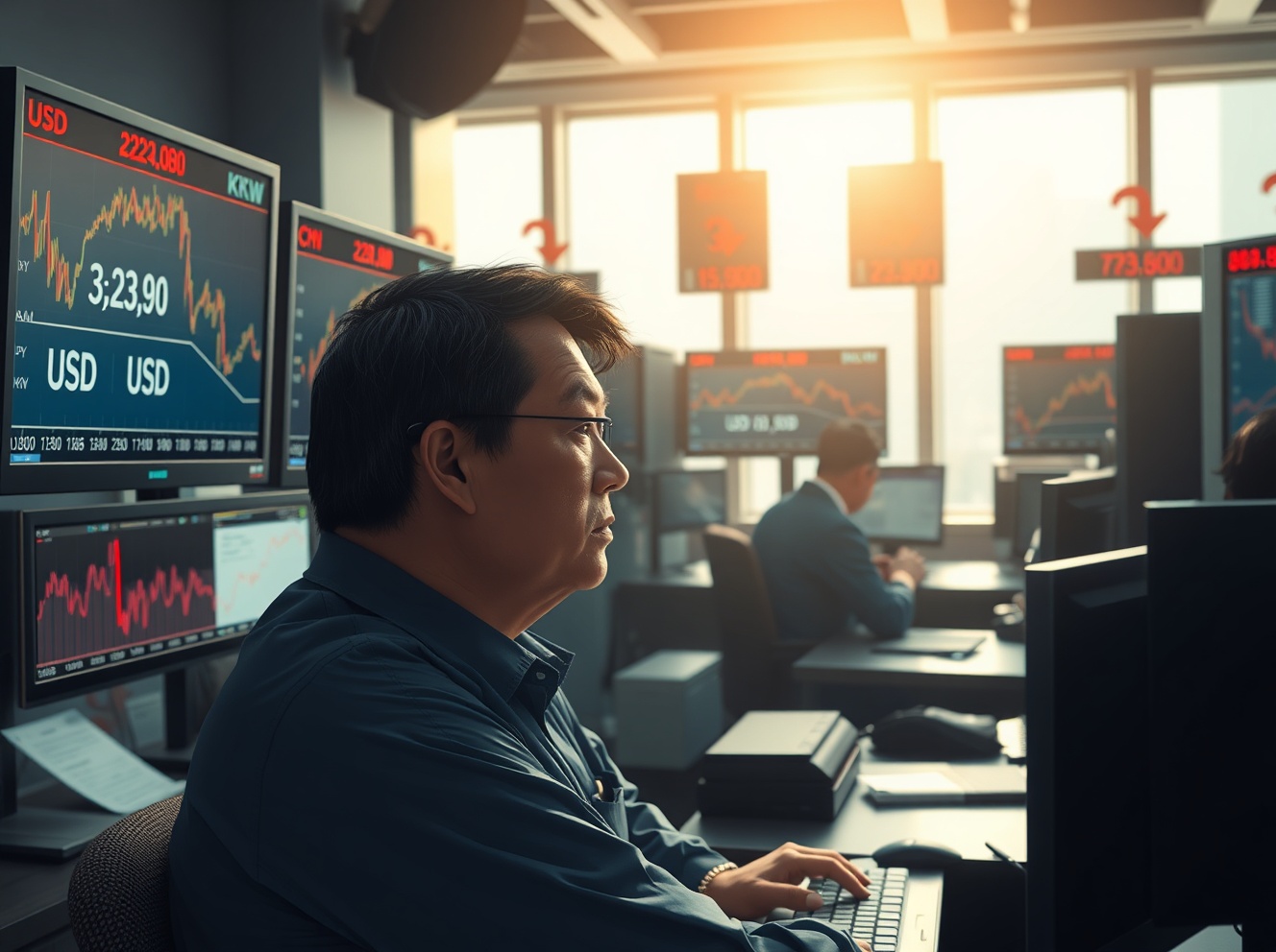 Asian currency trader monitors falling forex markets after Trump speech impacts risk sentiment