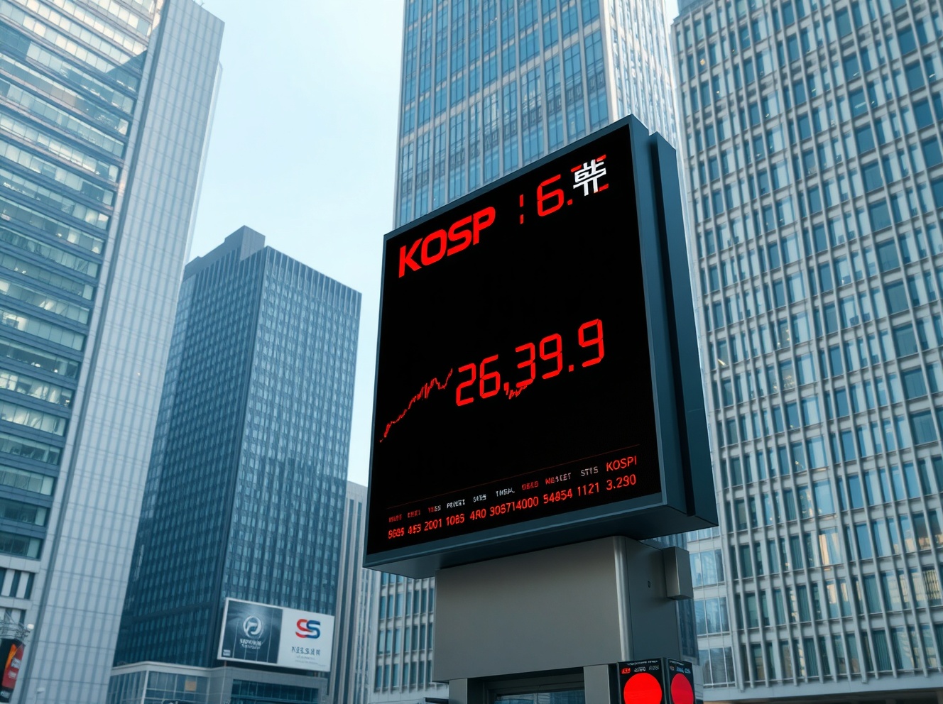KOSPI stock market decline in Seoul financial district showing Asian market correction