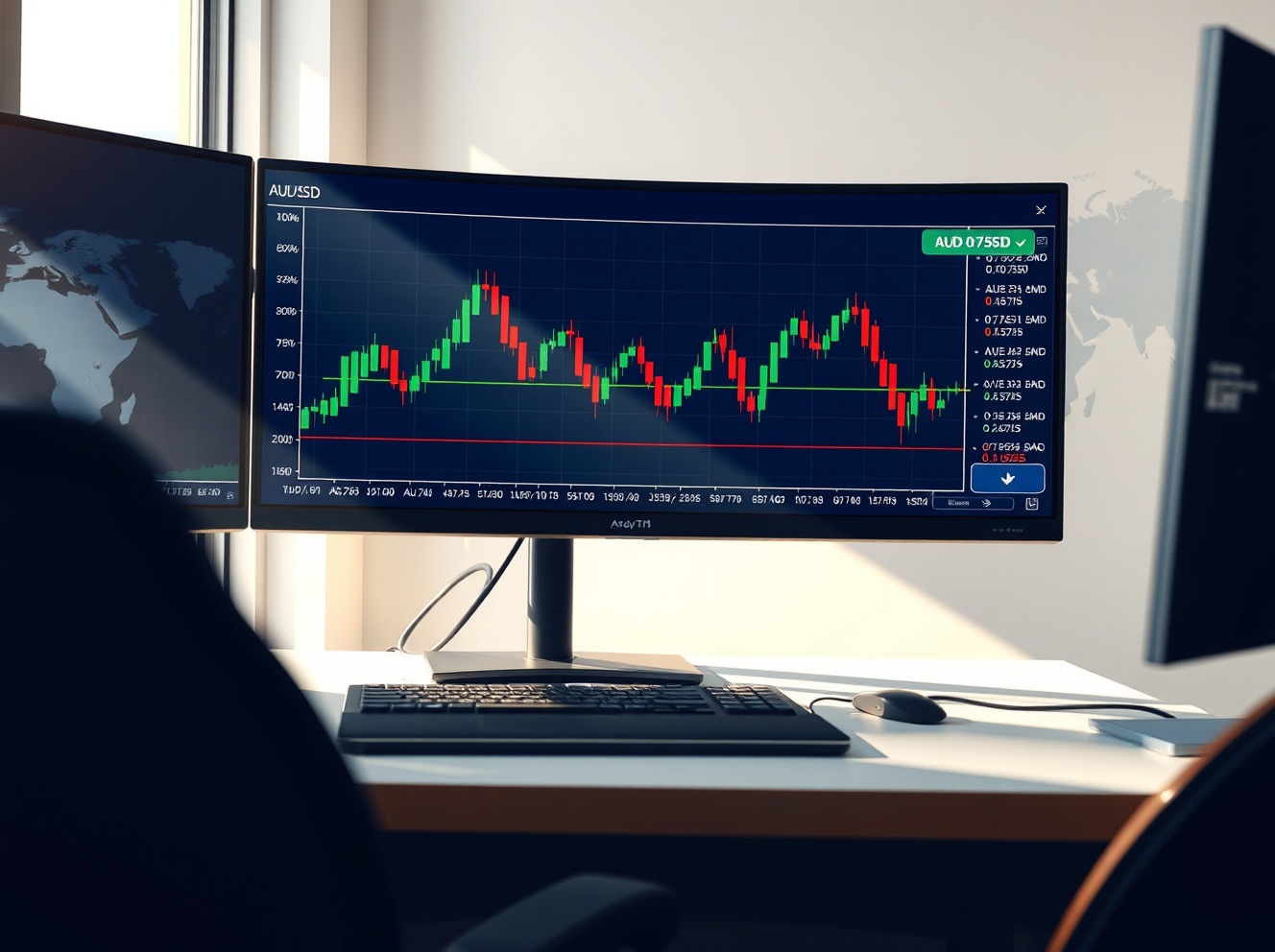 Forex trading terminal showing AUD/USD chart rising to 0.7150 amid geopolitical analysis.