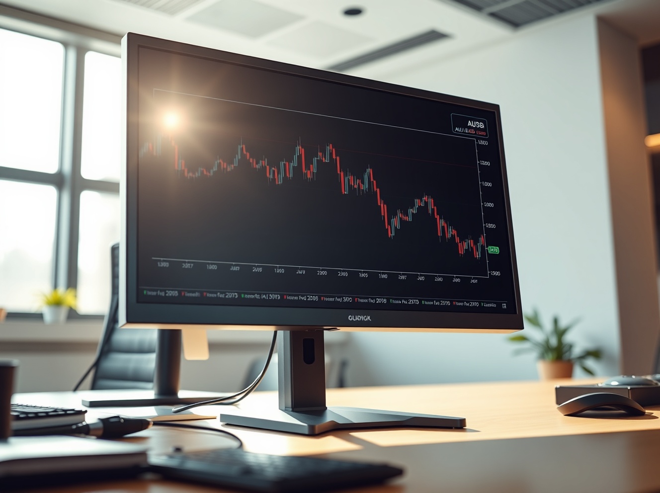 AUD/USD forex chart reacting to strong US Nonfarm Payrolls data on a trading desk monitor.