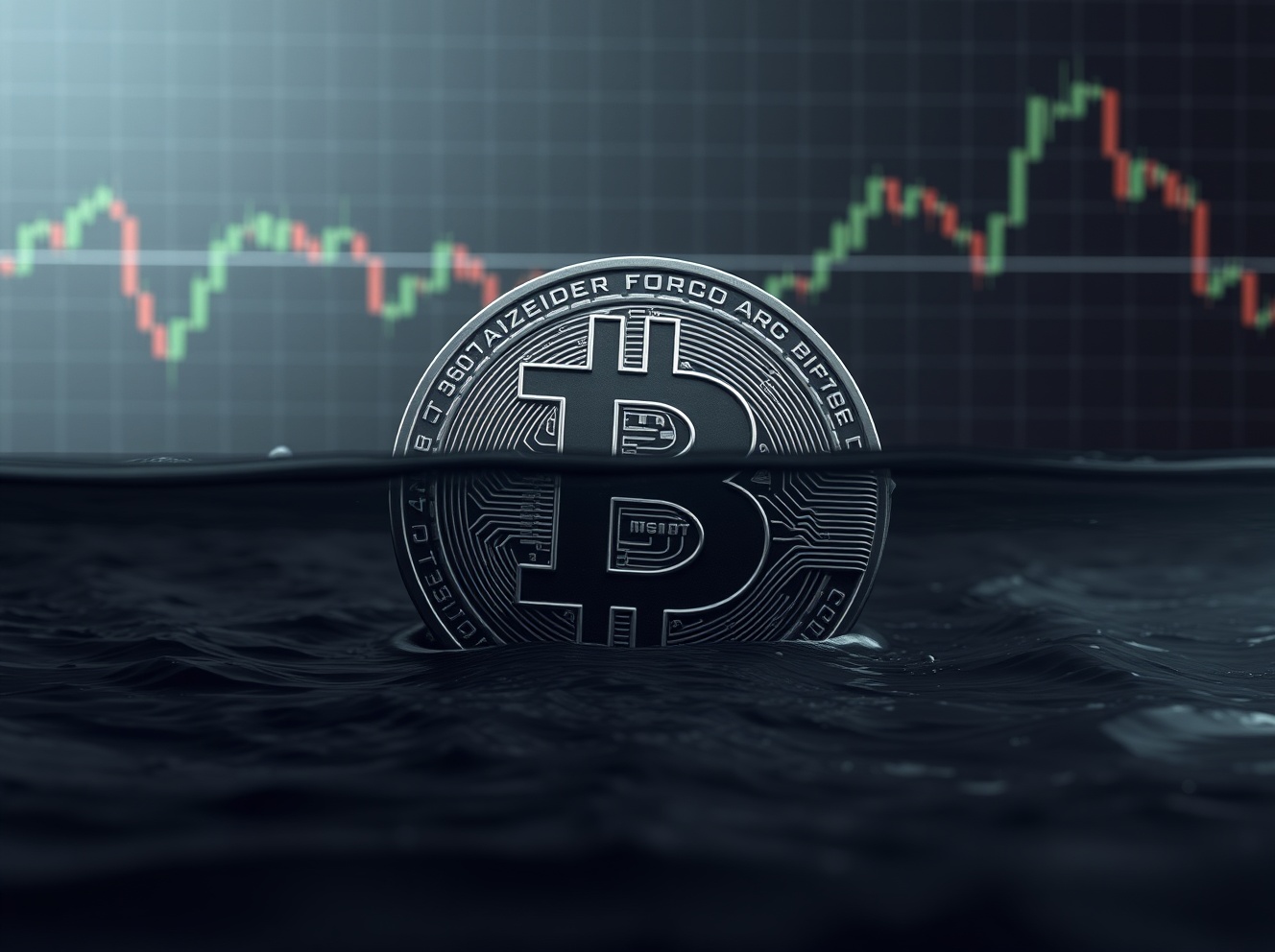 Bitcoin symbol partially submerged, representing the majority of BTC supply held at a loss according to Glassnode data.
