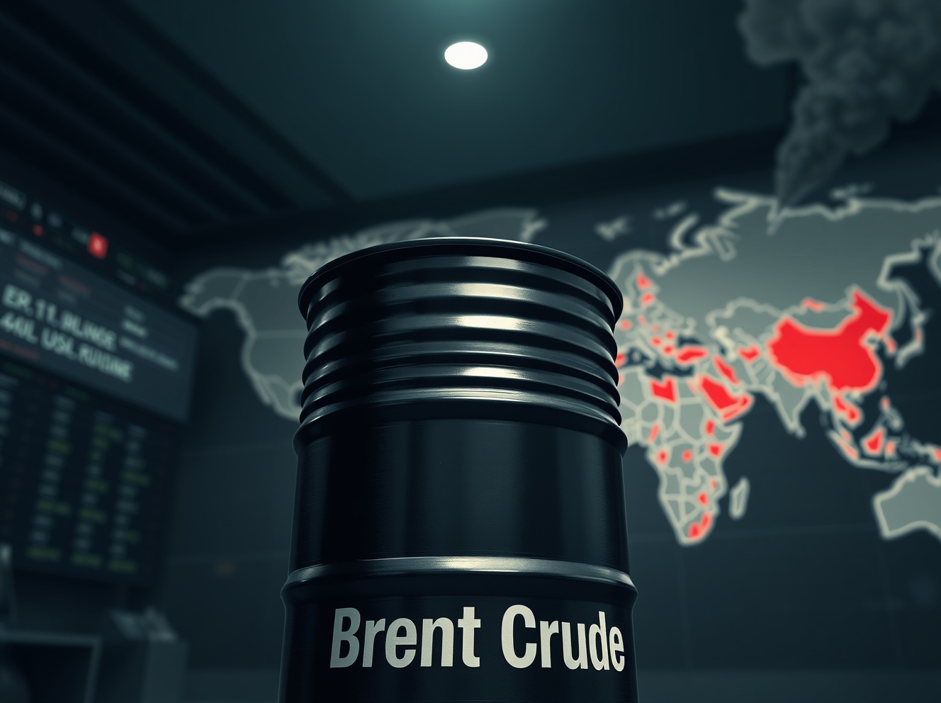 Brent crude oil barrel on trading floor with geopolitical conflict map in background