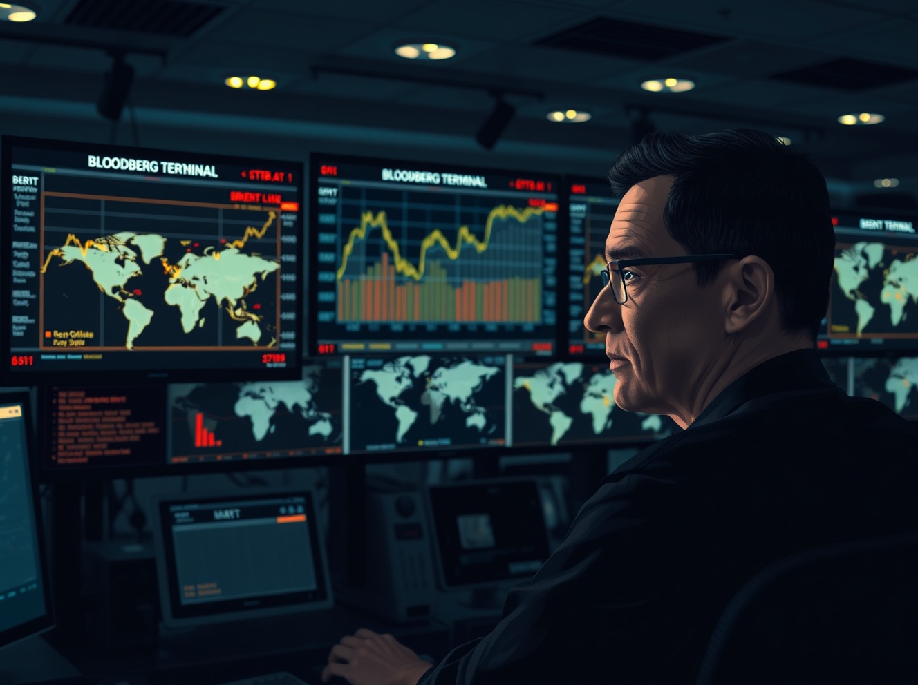 Financial analyst monitoring Brent crude oil price charts amid supply disruption risk assessment on trading desk