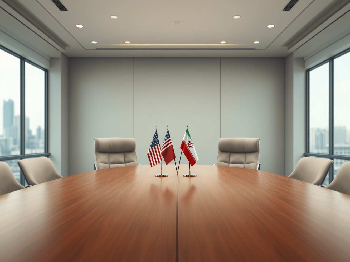 Empty negotiation chairs with U.S. and Iranian flags await the next round of diplomatic talks.