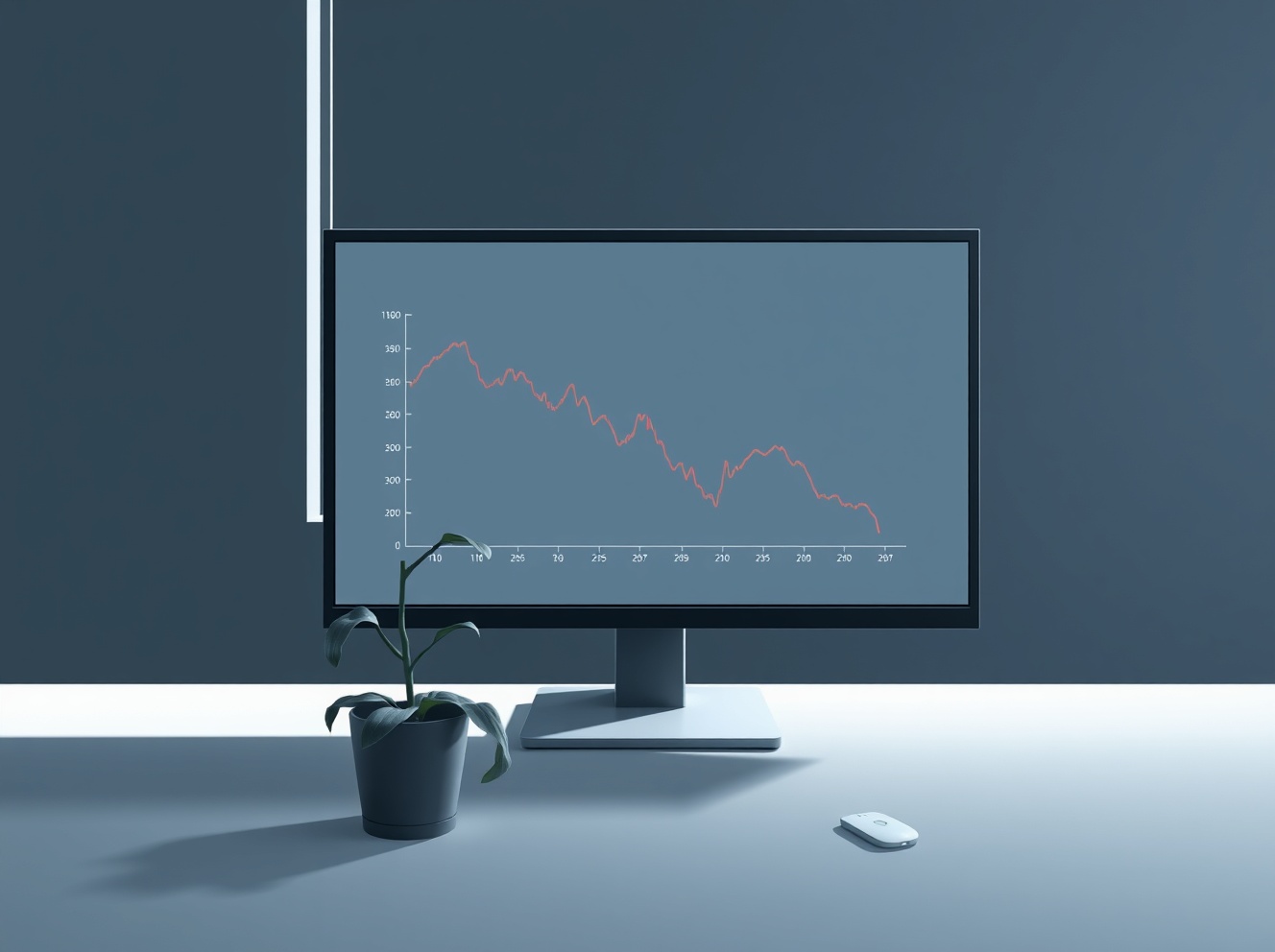 Empty office with cryptocurrency price chart showing decline, representing crypto project closures in bear market.