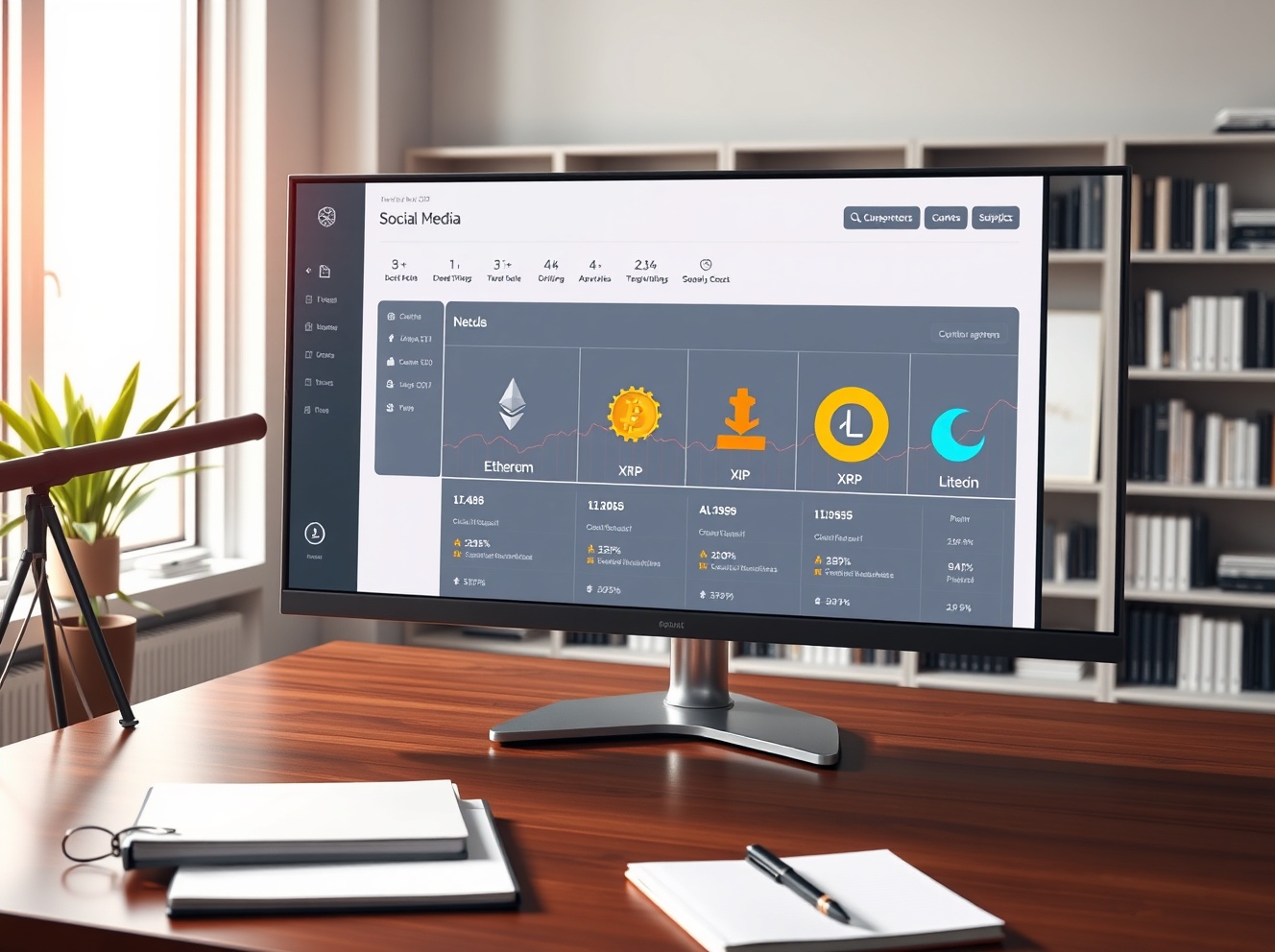 Analyst monitoring cryptocurrency social media trends on a dashboard showing Bitcoin, Ethereum, XRP, Chainlink, and Litecoin data.