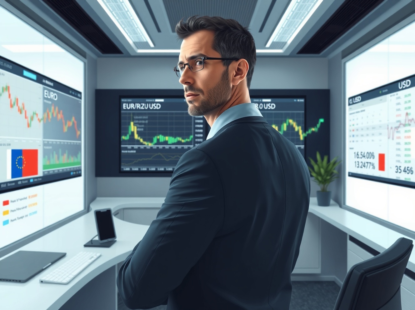 Financial analyst examining EUR/USD currency charts and ECB policy data in trading environment