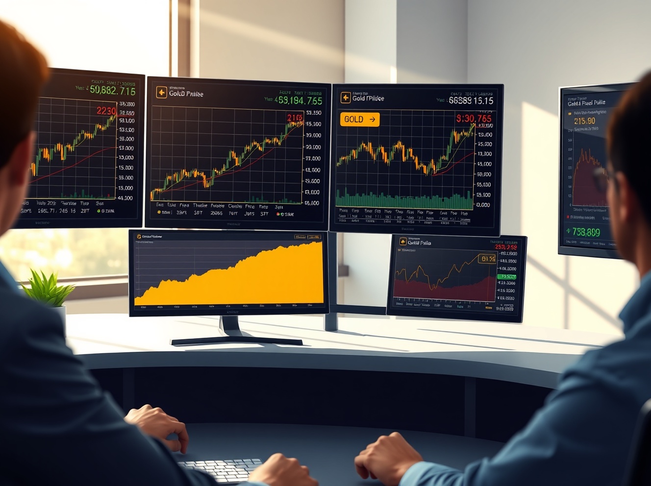 Gold price analysis showing trading desk with real-time charts of gold prices and bond yields impacting precious metals market