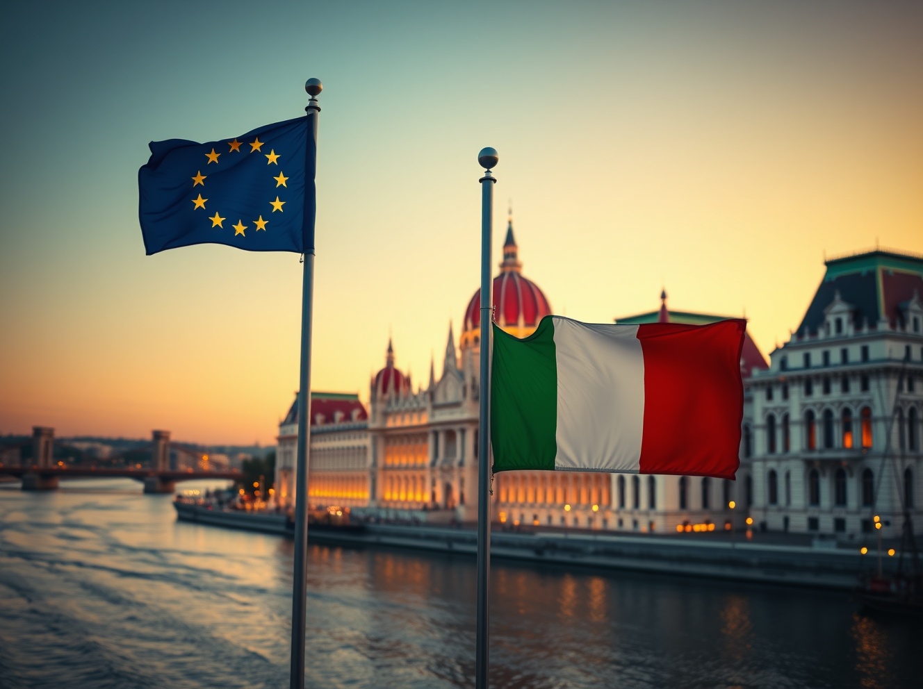 Hungarian Parliament with EU and Hungarian flags symbolizing strengthened political and economic ties