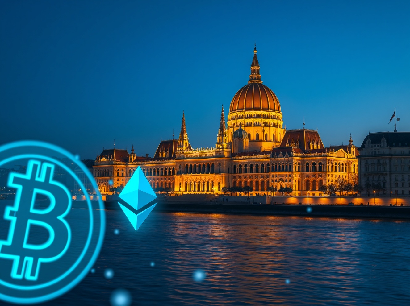 Hungarian Parliament with cryptocurrency symbols representing potential regulatory changes after election.