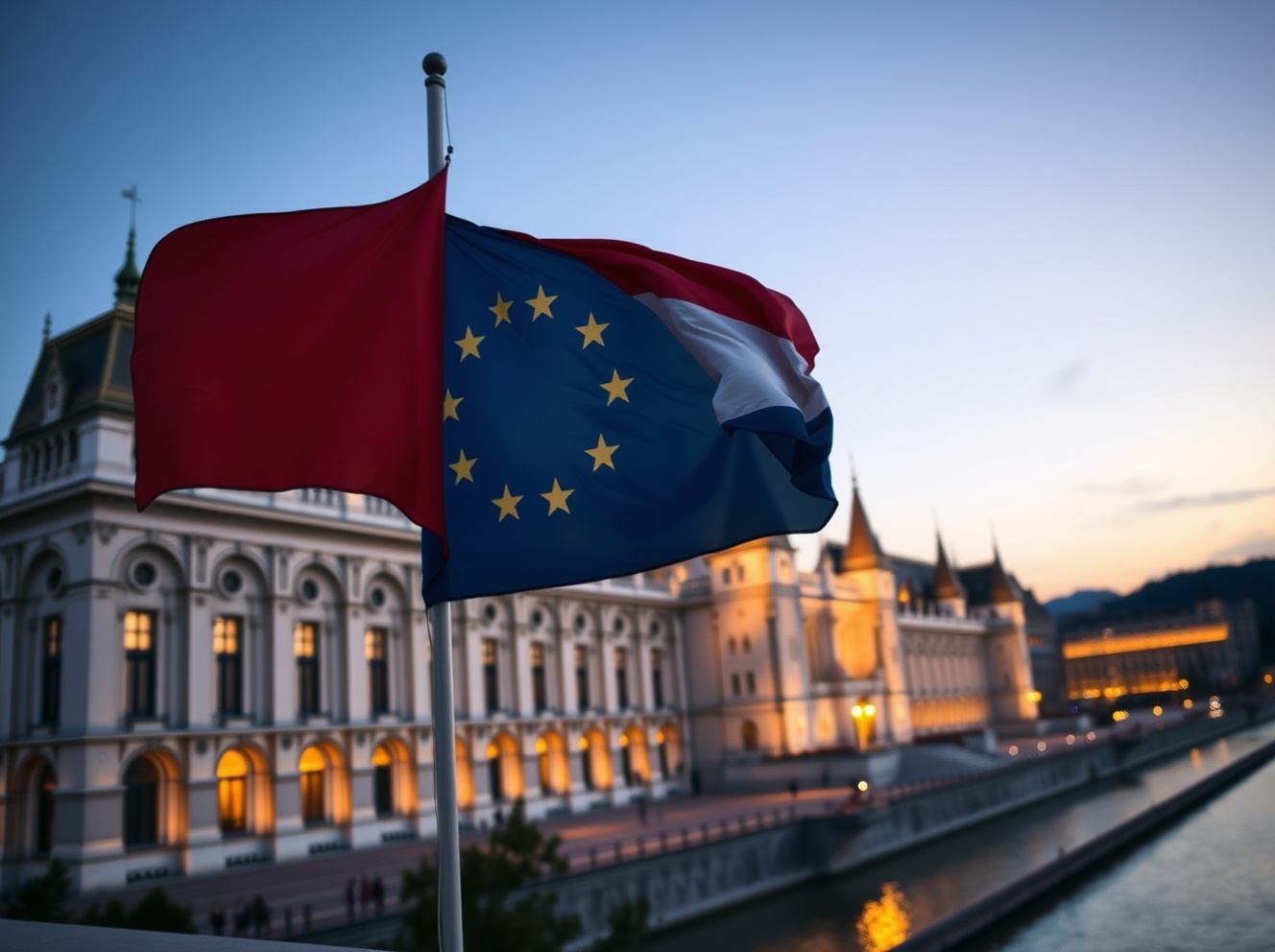 Hungarian Parliament with EU and Hungarian flags representing economic policy and euro adoption discussions