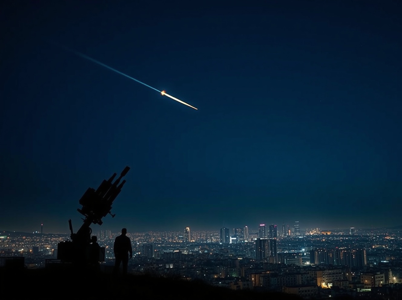 IDF Iron Dome system intercepting missile threat over Tel Aviv skyline at night.