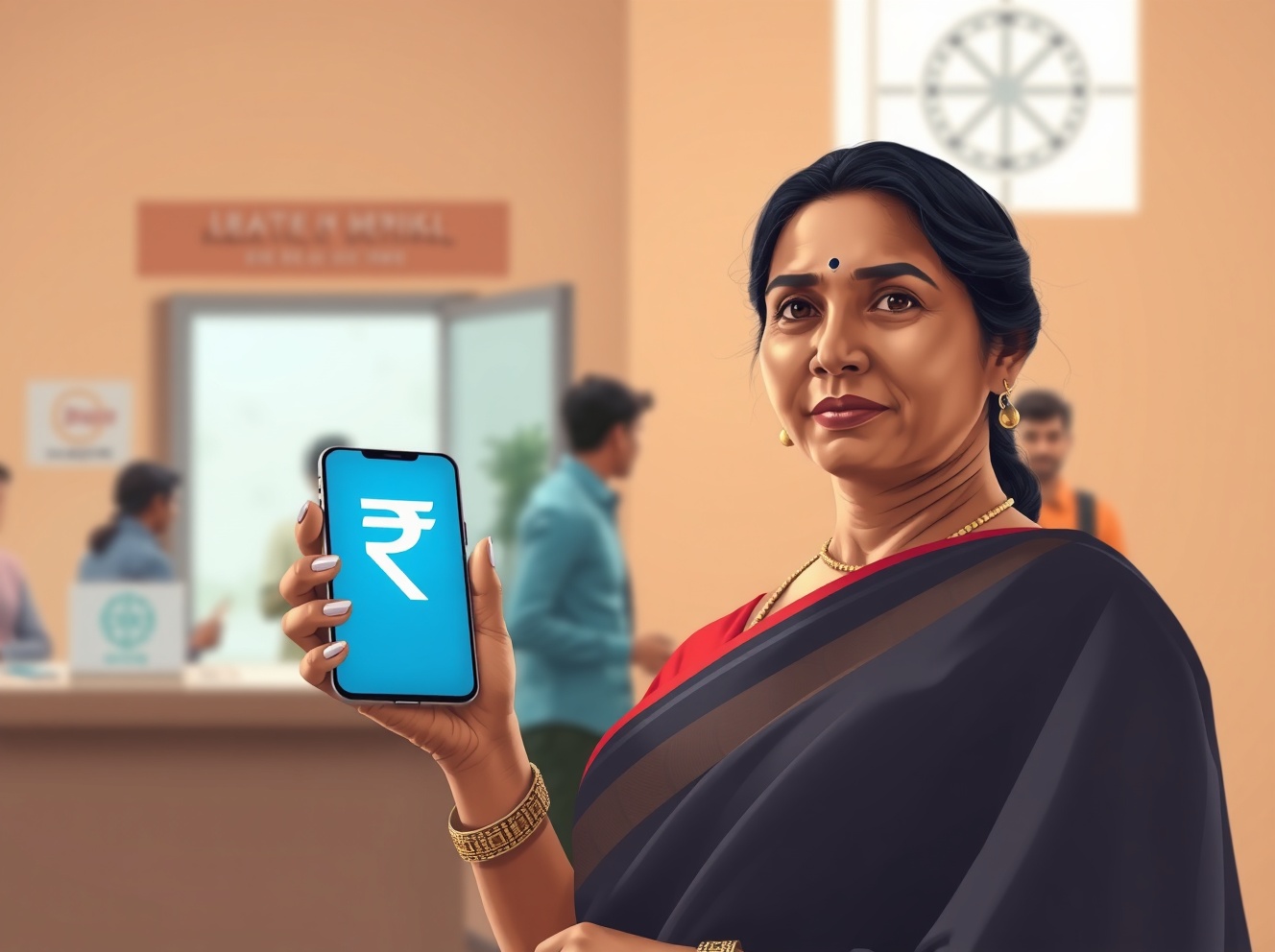 India CBDC e-rupee used for government welfare payments with a woman using a smartphone in a government office