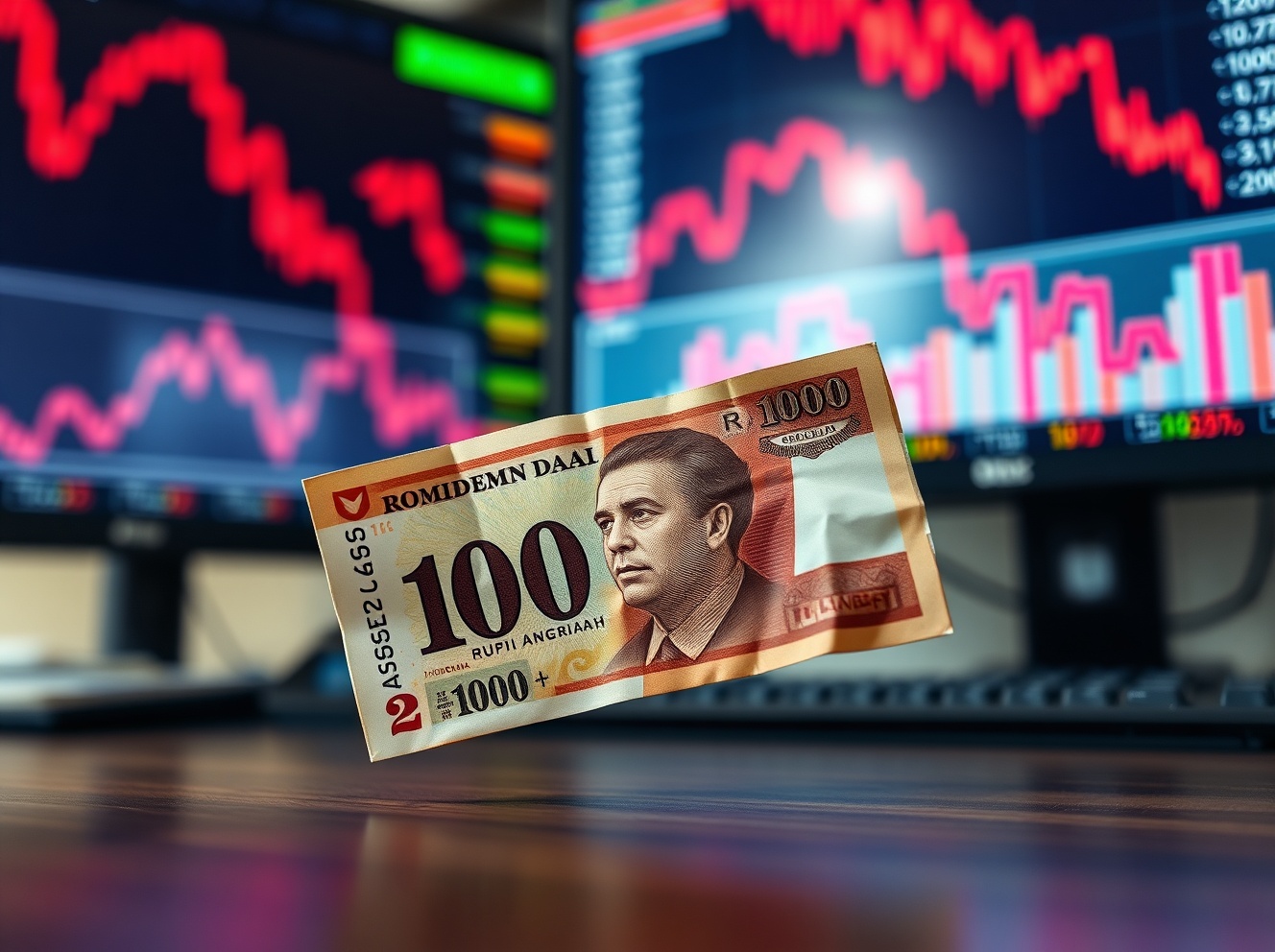 Indonesian Rupiah banknote against financial charts showing currency crisis and record low value.