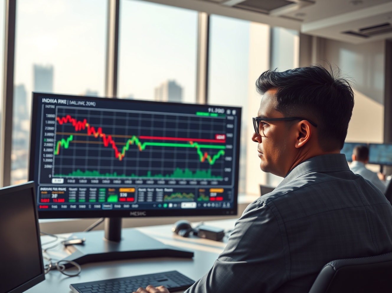 Analysis of Indian Rupee selling pressure shown on a trading desk monitor with BNY Mellon flow data.
