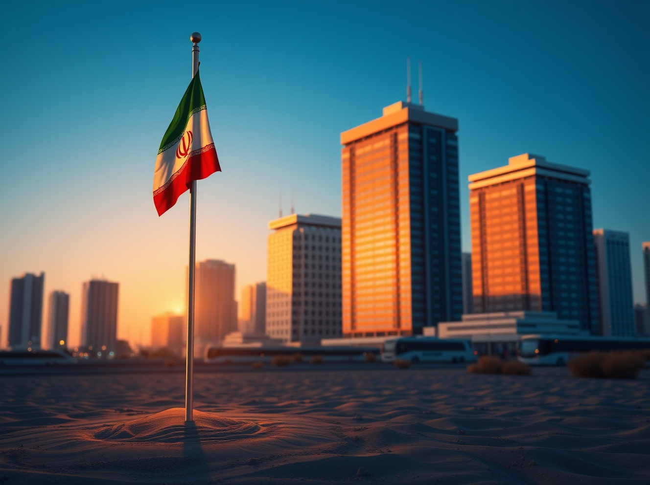 Iran's Revolutionary Guard threat to US companies in the Middle East symbolized by flag and cityscape.