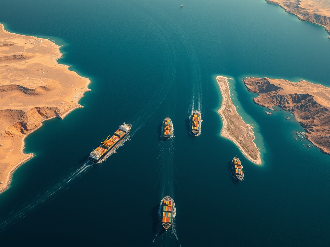 Aerial view of the strategic Strait of Hormuz waterway showing maritime traffic and coastlines.