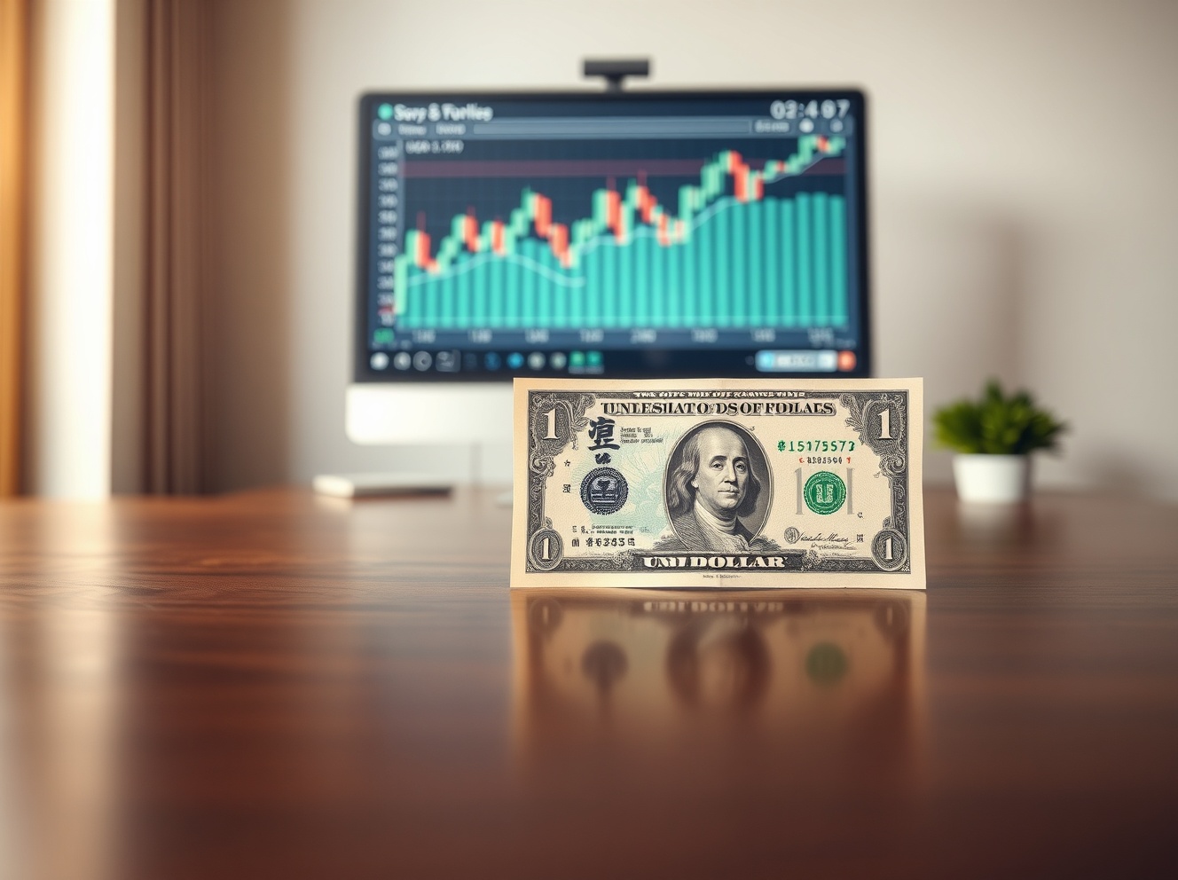 Japanese Yen and US Dollar banknotes on a desk with a blurred USD/JPY chart in the background, representing currency market analysis ahead of the Fed policy update.