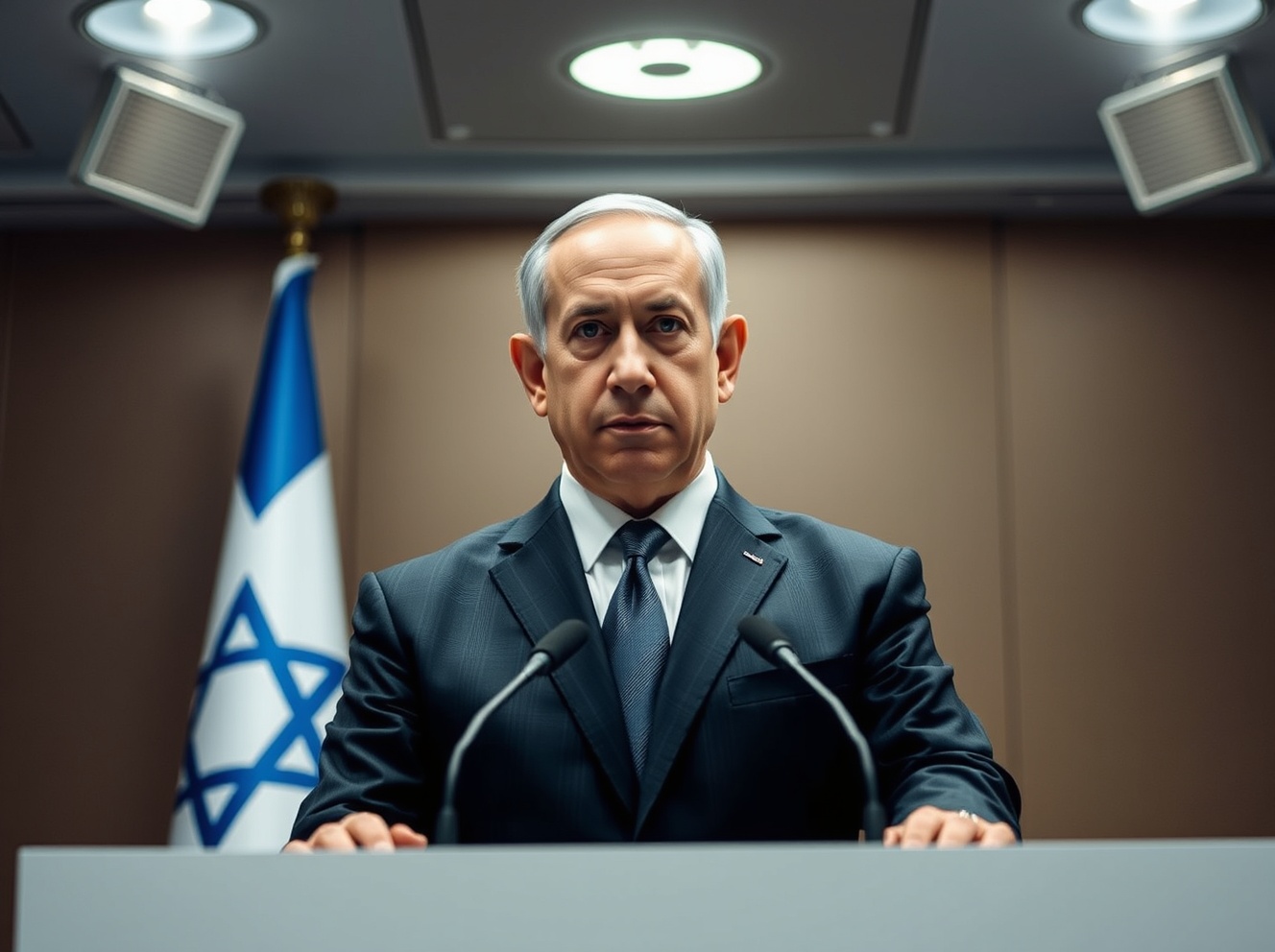 Israeli Prime Minister Benjamin Netanyahu making a statement on Hezbollah attacks and regional security.