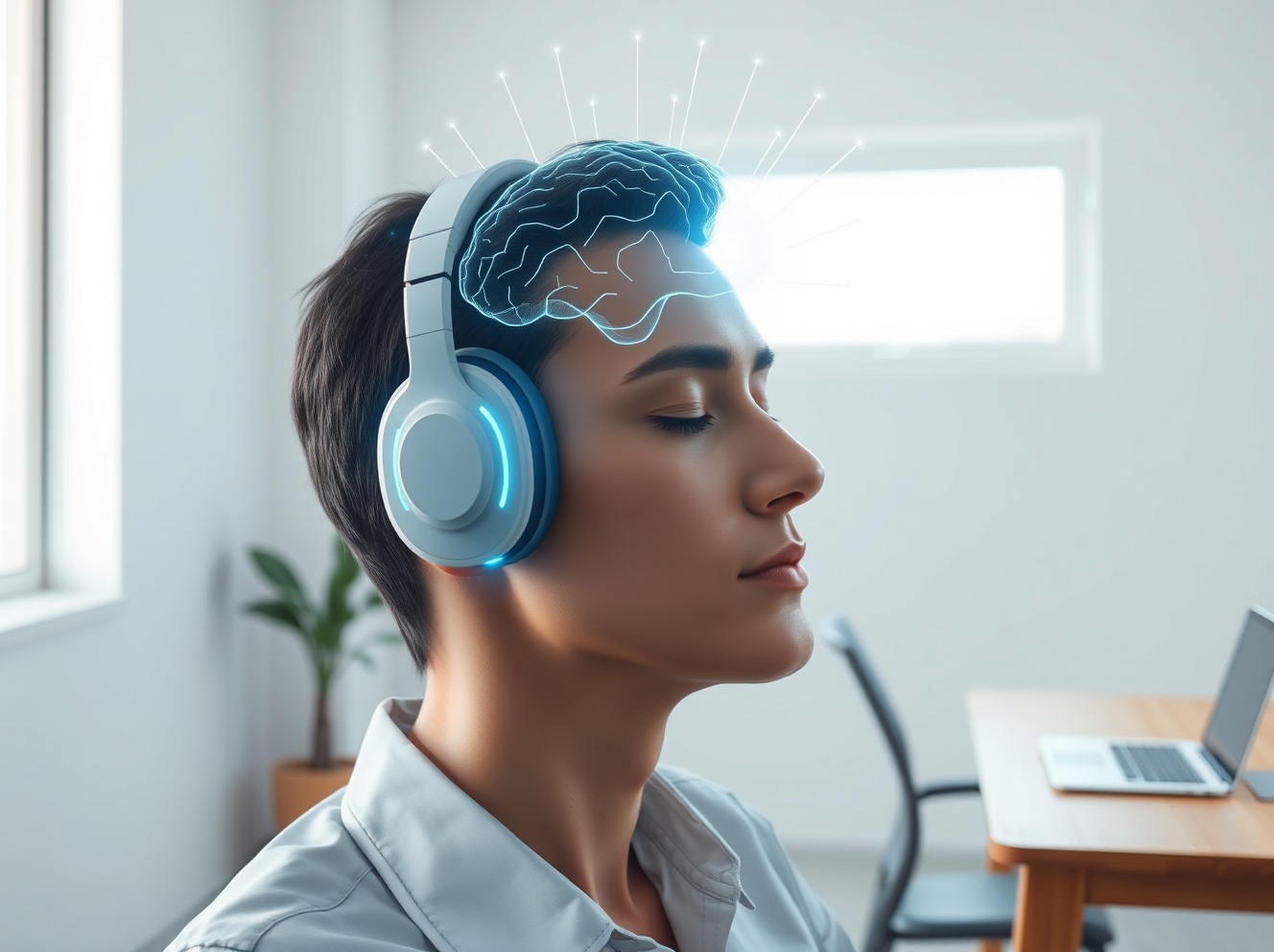 Neurable brain-computer interface technology visualized as a holographic brain scan above a person wearing EEG headphones
