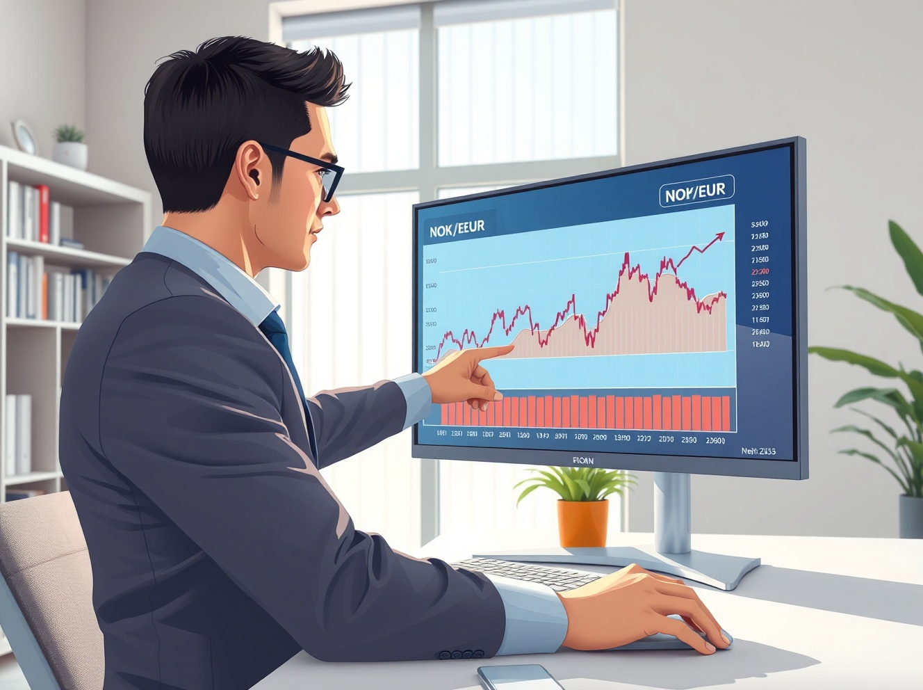Financial analyst examines NOK exchange rate chart in Commerzbank policy analysis