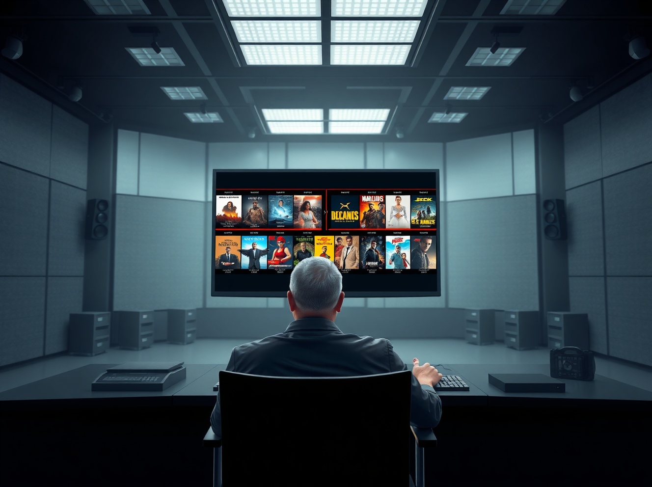 AI film production concept showing multiple movie ideas generated simultaneously in a studio.