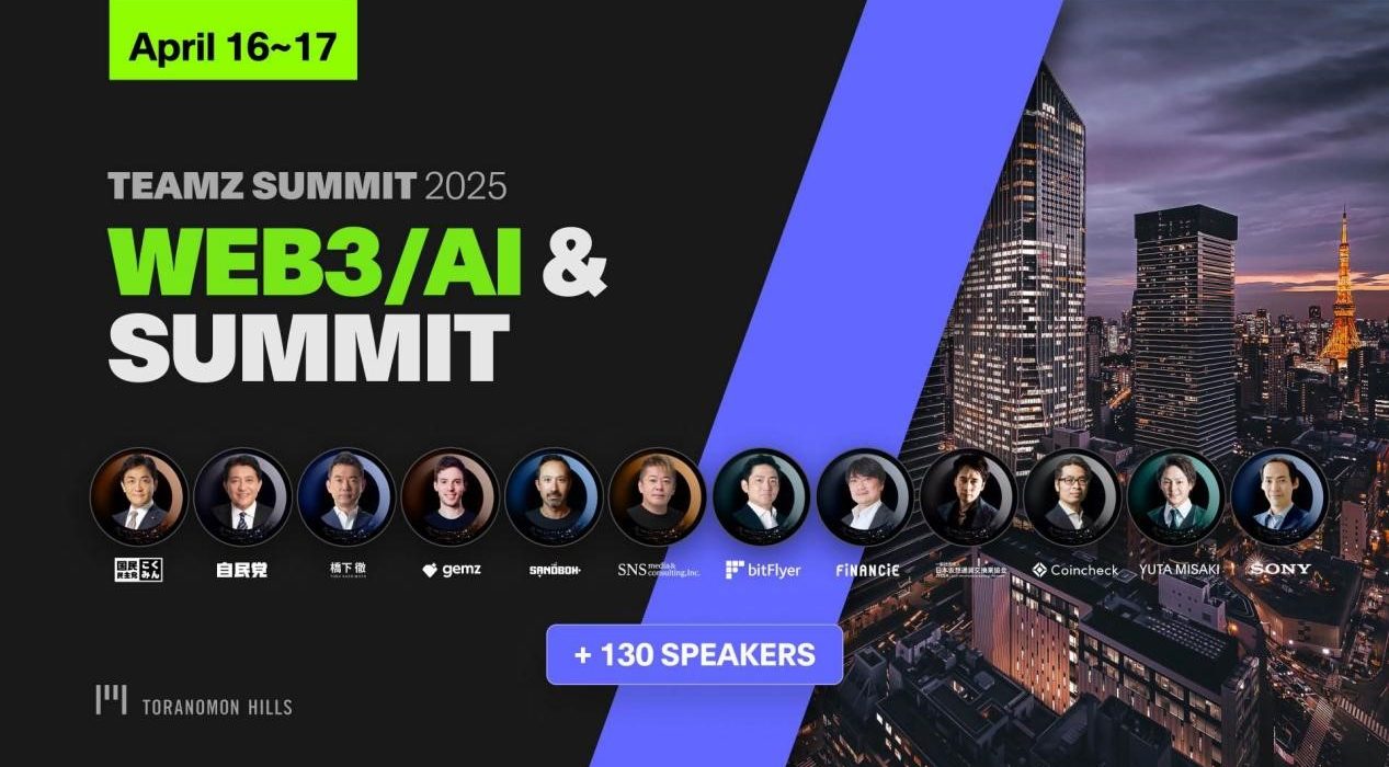 From April 16 (wed.) to 17 (thu.), 2025, one of Japan’s largest Web3 and AI conferences, “TEAMZ SUMMIT 2025,” will be held at Toranomon Hills International Forum! This event will bring together leaders from the Web3 and AI industries, government officials, investors, startups, and major tech companies to discuss future technological innovations and market possibilities.