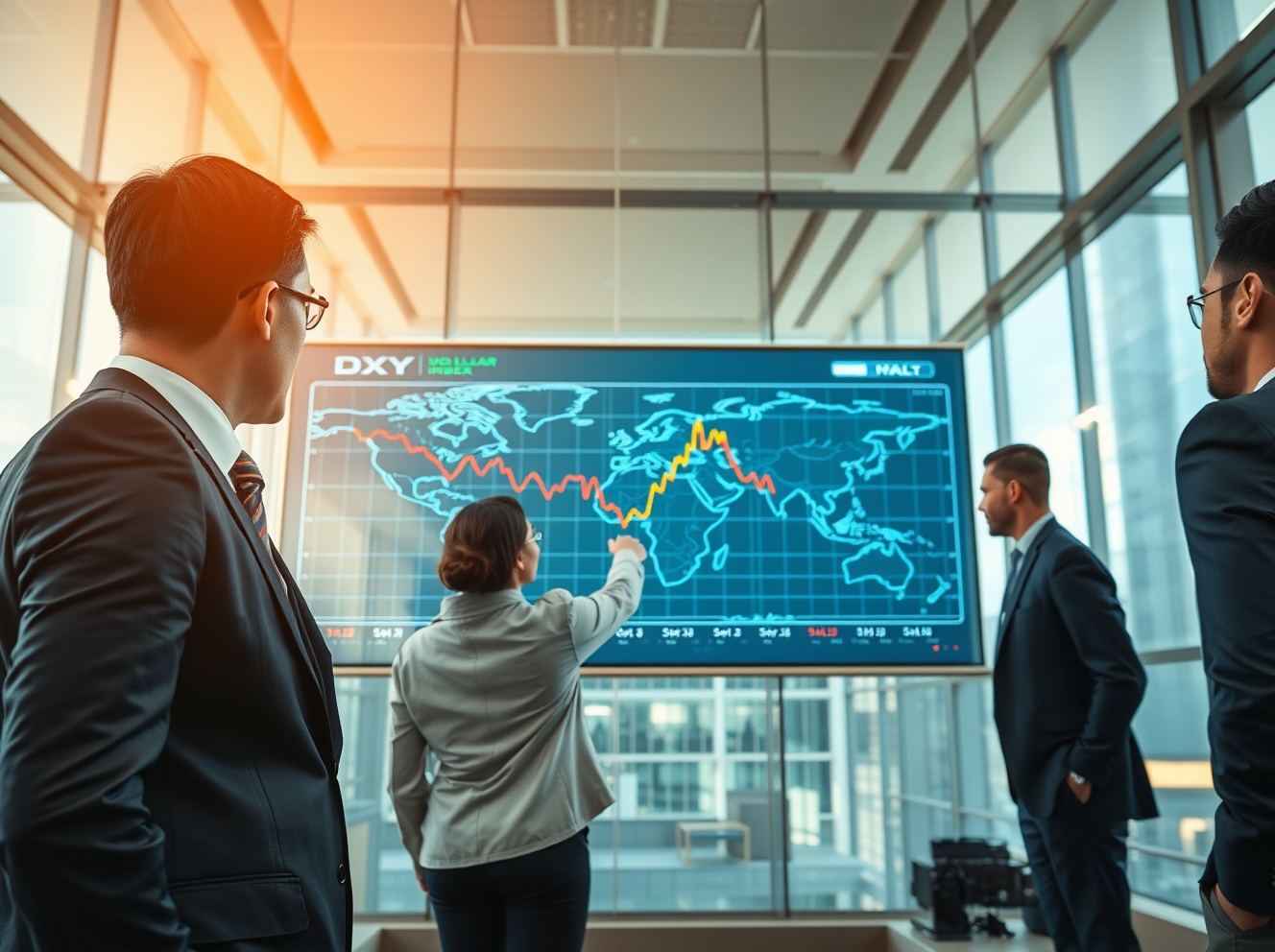 Financial analysts monitoring US Dollar Index chart showing pressure from capital reallocation trends.