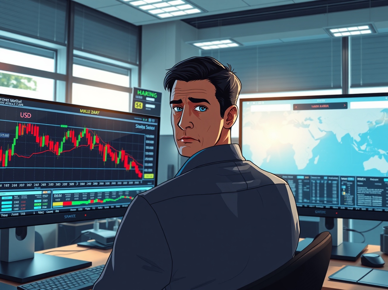 Forex trader analyzing US Dollar charts amid Hormuz geopolitical tensions affecting currency markets