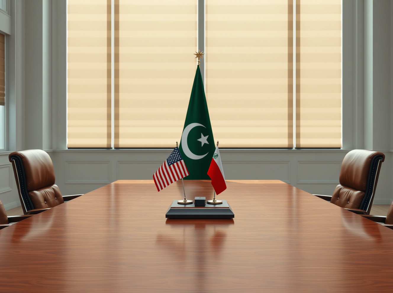 Diplomatic table setup for US-Iran negotiations in Pakistan with American and Iranian flags