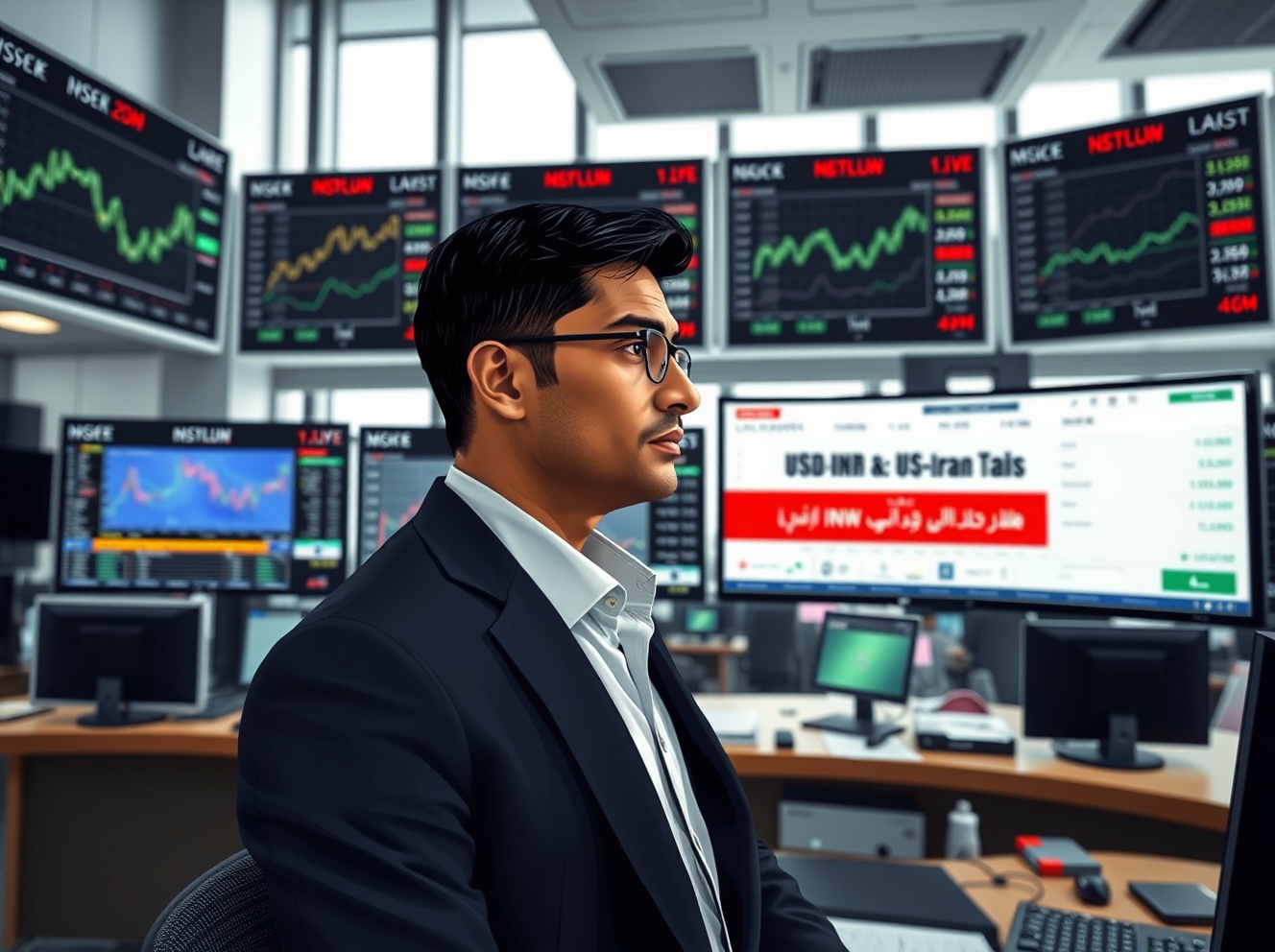 Financial trader analyzing USD/INR exchange rate during US-Iran diplomatic talks in Pakistan