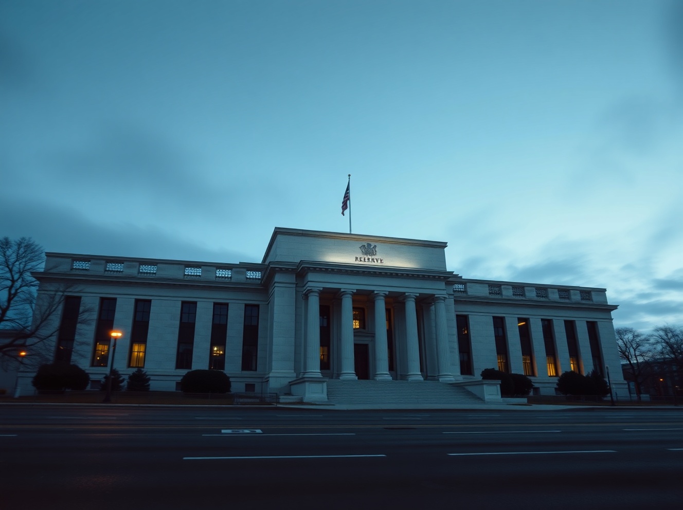 Federal Reserve building in Washington D.C. at dusk, representing the USD softens as markets await Fed decision, with BNY analysis.